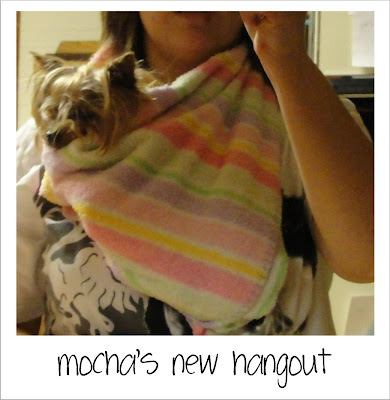 I had this whole blog post about my over packed day, wintery weather, taxing kiddos, house remodeling and how I made up for that one lazy day. Then I did something that made my family look at me sideways, shake their heads in disbelief and request that I don't tell people we are related. Before you see the pic *you already peeked didn't you?* I have to explain about my dog. Mocha is my 3 lb Yorkie, she'll be 4 yrs old this summer. Being so little kids think they can just pick her up. This terrifies her. Whenever the girls have friends over Mocha wants me to hold her the whole time. Tonight Abby has a friend sleeping over which means Mocha keeps pawing at me to be held. If she would be happy just laying down on my lap that would be fine. But she keeps trying to climb into my arms which is making it hard to type. So I took a baby blanket, folded it half diagonally, tied it and made a sling to wear her around my neck. Within five minutes of being in it she calmed down and went to sleep. And I have my hand free and am able to type. Am I a genius or what!?
